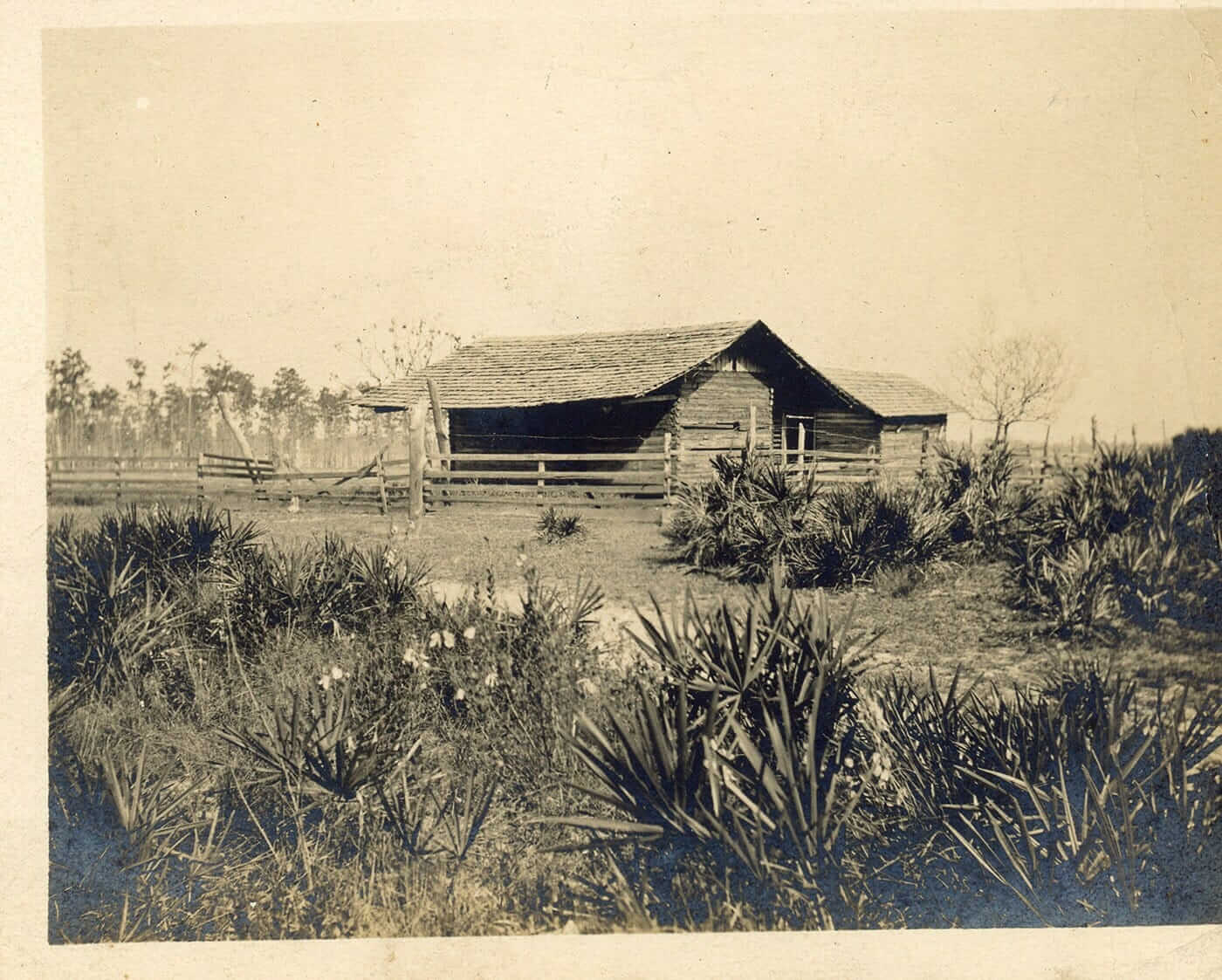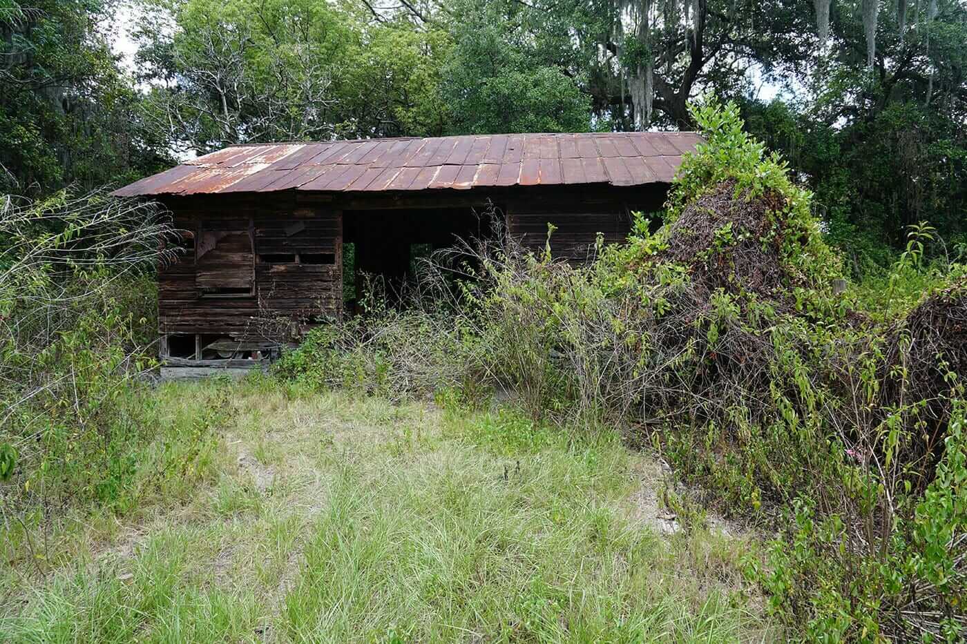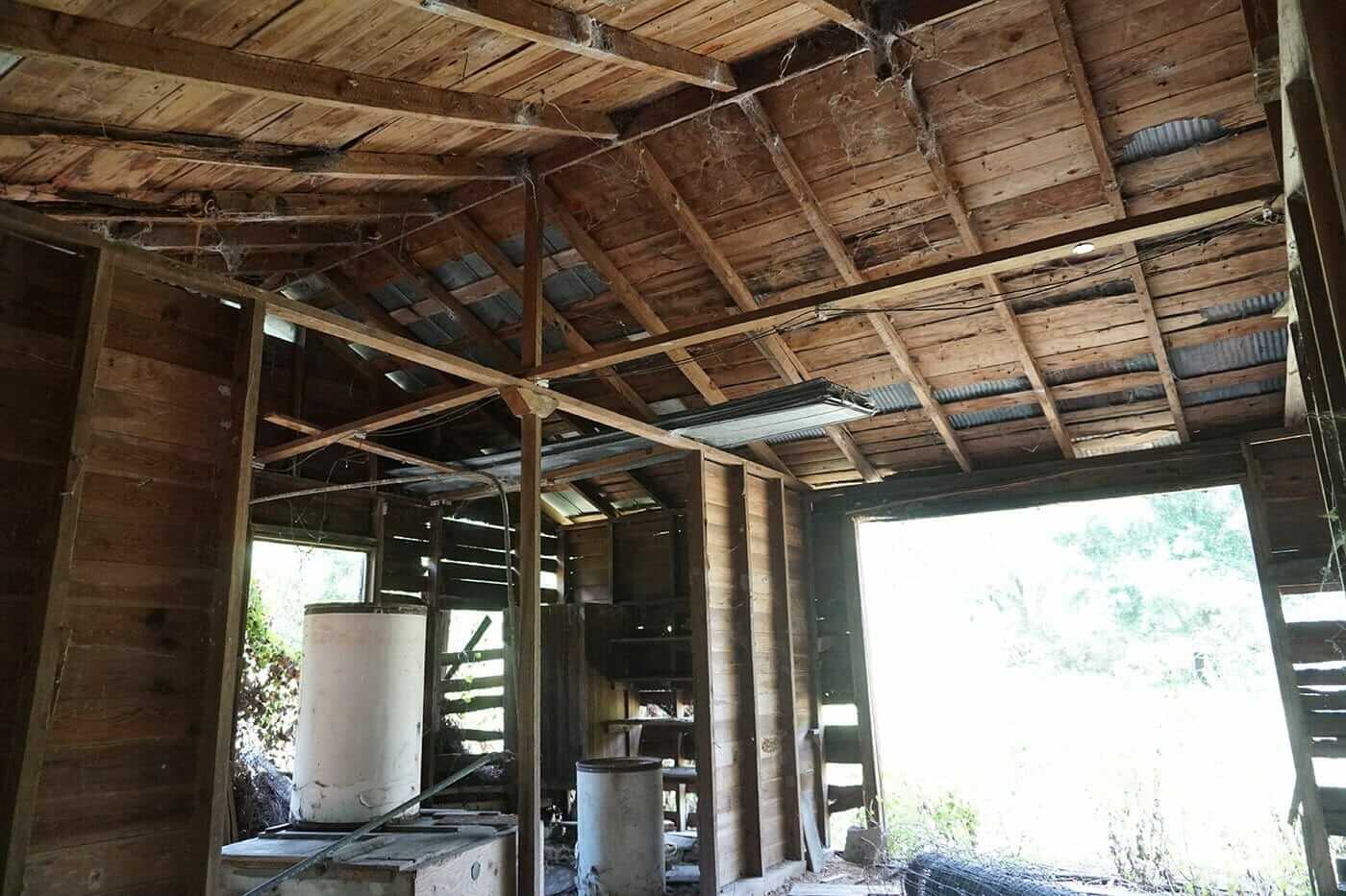 Follow the trail north of the Nest to find the barn structure as you head toward Ten Mile Lake. The barn is roughly 110 yards north-northwest of the Nest and measures 20 by 26 feet. It’s a single-story, wood-frame building with a gable roof. The structure is divided into three sections by wood partitions that reach the eaves. The north section has a dirt floor and a large open space on the east wall, indicating it was likely used to house livestock. The middle section features a wide opening on the west side, covered by a sliding wooden door, and a brick-paved floor probably used for parking farm vehicles. The south section seems to be a workroom with a concrete slab floor, housing pump equipment, built-in shelves, and storage cabinets. Parts of the original fenced corral attached to the barn for animal turnout are still visible and can be identified using historic maps and site drawings