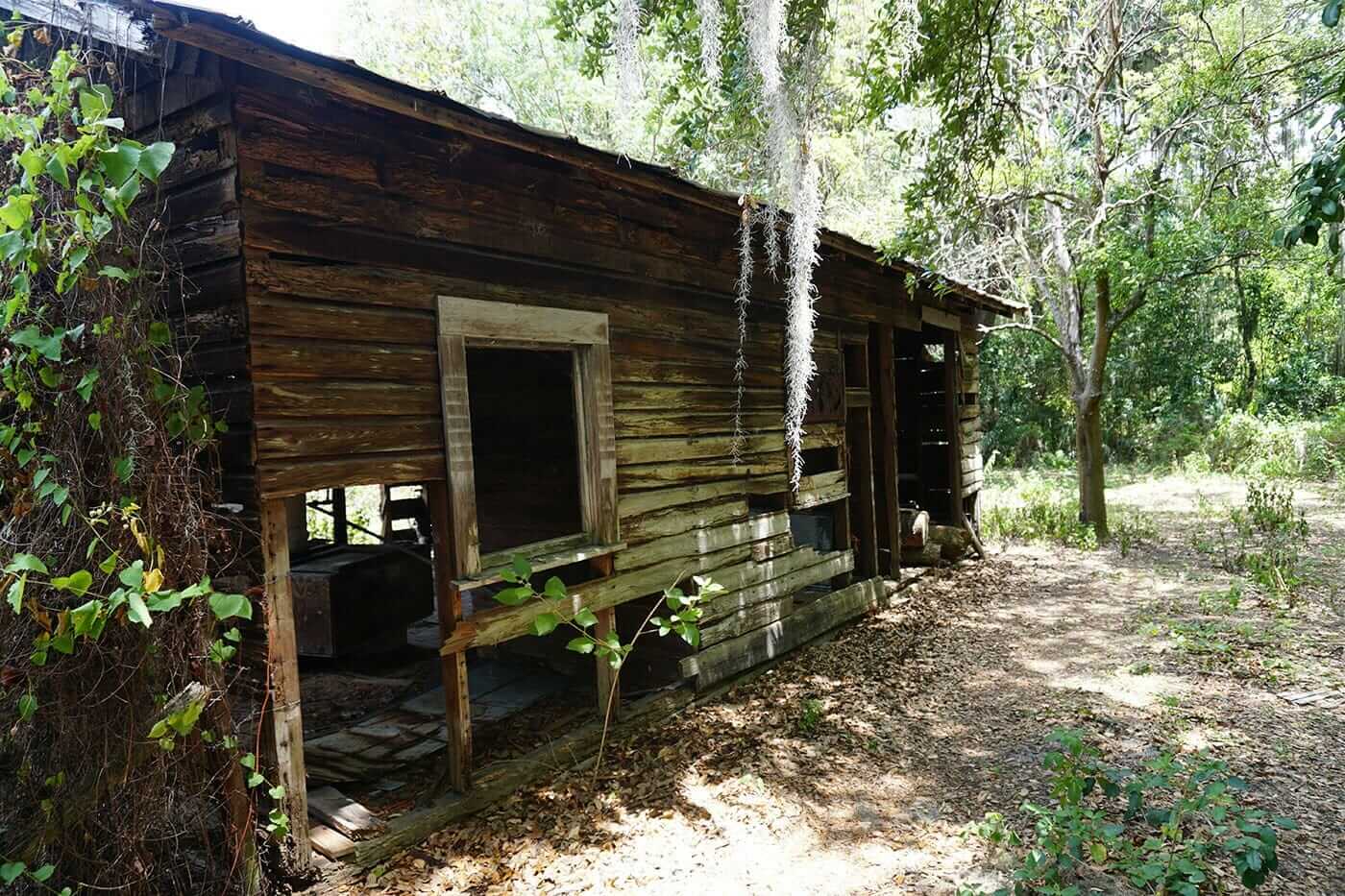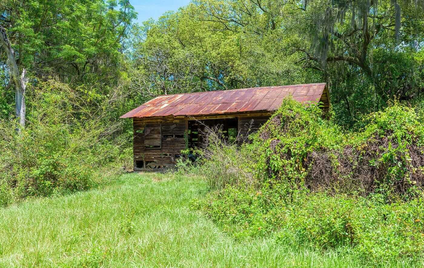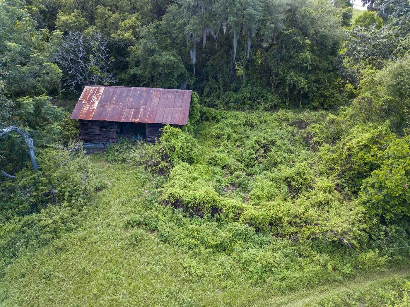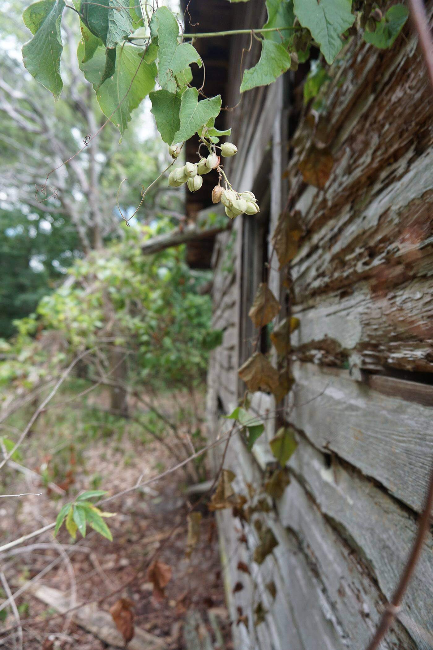 Follow the trail north of the Nest to find the barn structure as you head toward Ten Mile Lake. The barn is roughly 110 yards north-northwest of the Nest and measures 20 by 26 feet. It’s a single-story, wood-frame building with a gable roof. The structure is divided into three sections by wood partitions that reach the eaves. The north section has a dirt floor and a large open space on the east wall, indicating it was likely used to house livestock. The middle section features a wide opening on the west side, covered by a sliding wooden door, and a brick-paved floor probably used for parking farm vehicles. The south section seems to be a workroom with a concrete slab floor, housing pump equipment, built-in shelves, and storage cabinets. Parts of the original fenced corral attached to the barn for animal turnout are still visible and can be identified using historic maps and site drawings
