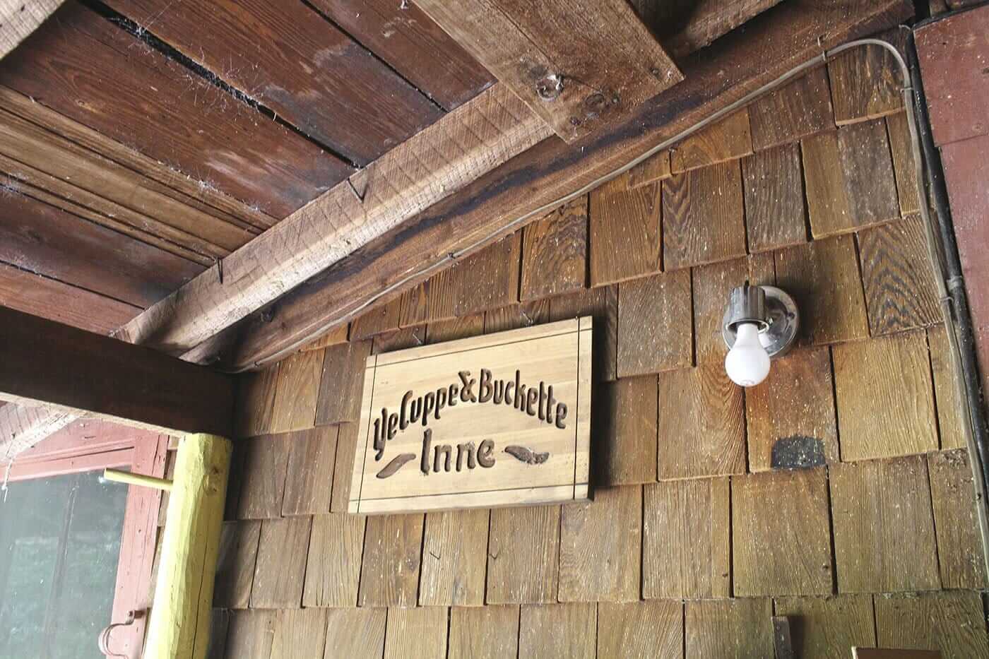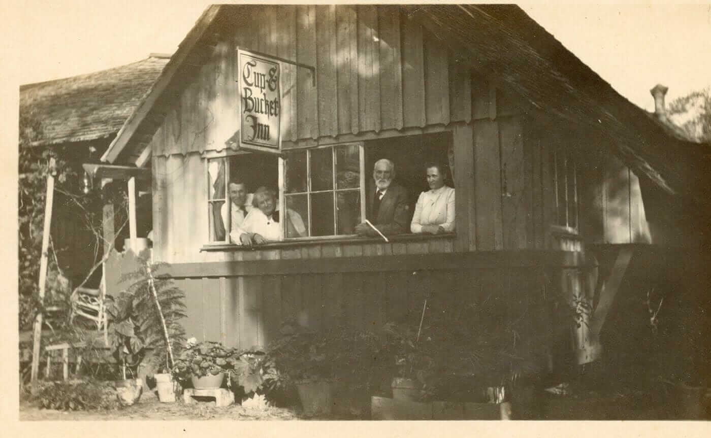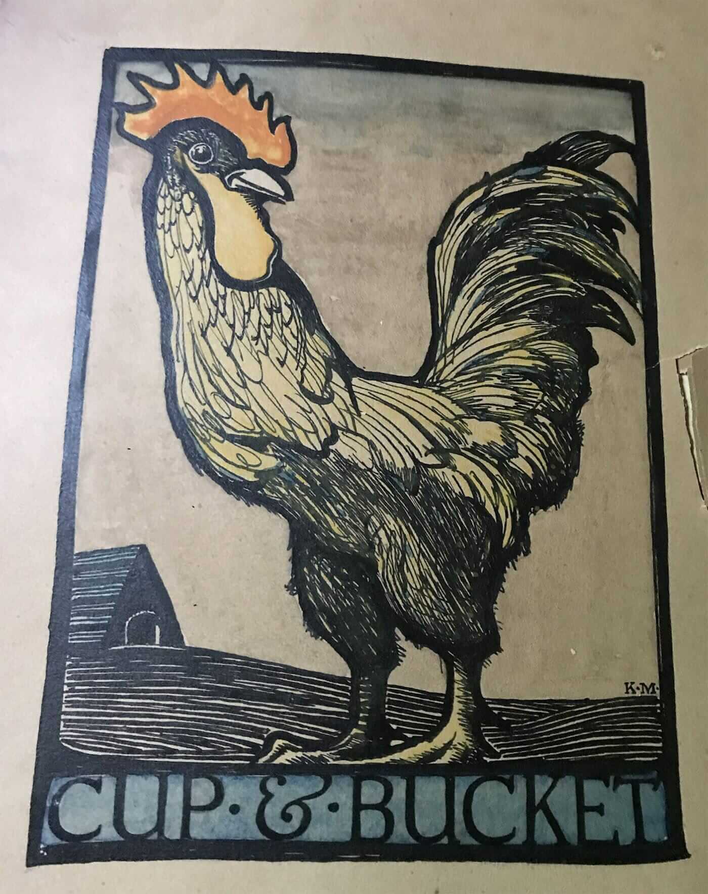 The Cup & Bucket was the name given to the main porch because of its proximity to the well and the always-present utensils for its use. The original kitchen and dining room was called the Cup and Bucket Inn, with Karl Moseley designing a whimsical sign for the building that included one of his rooster drawings.