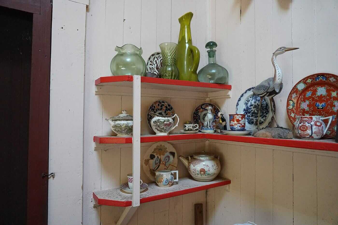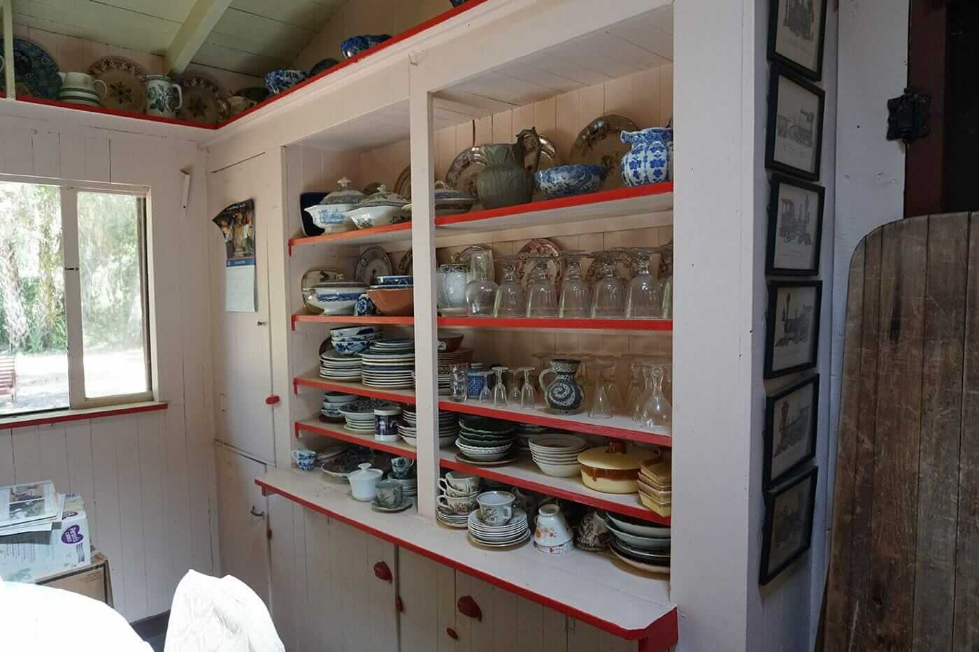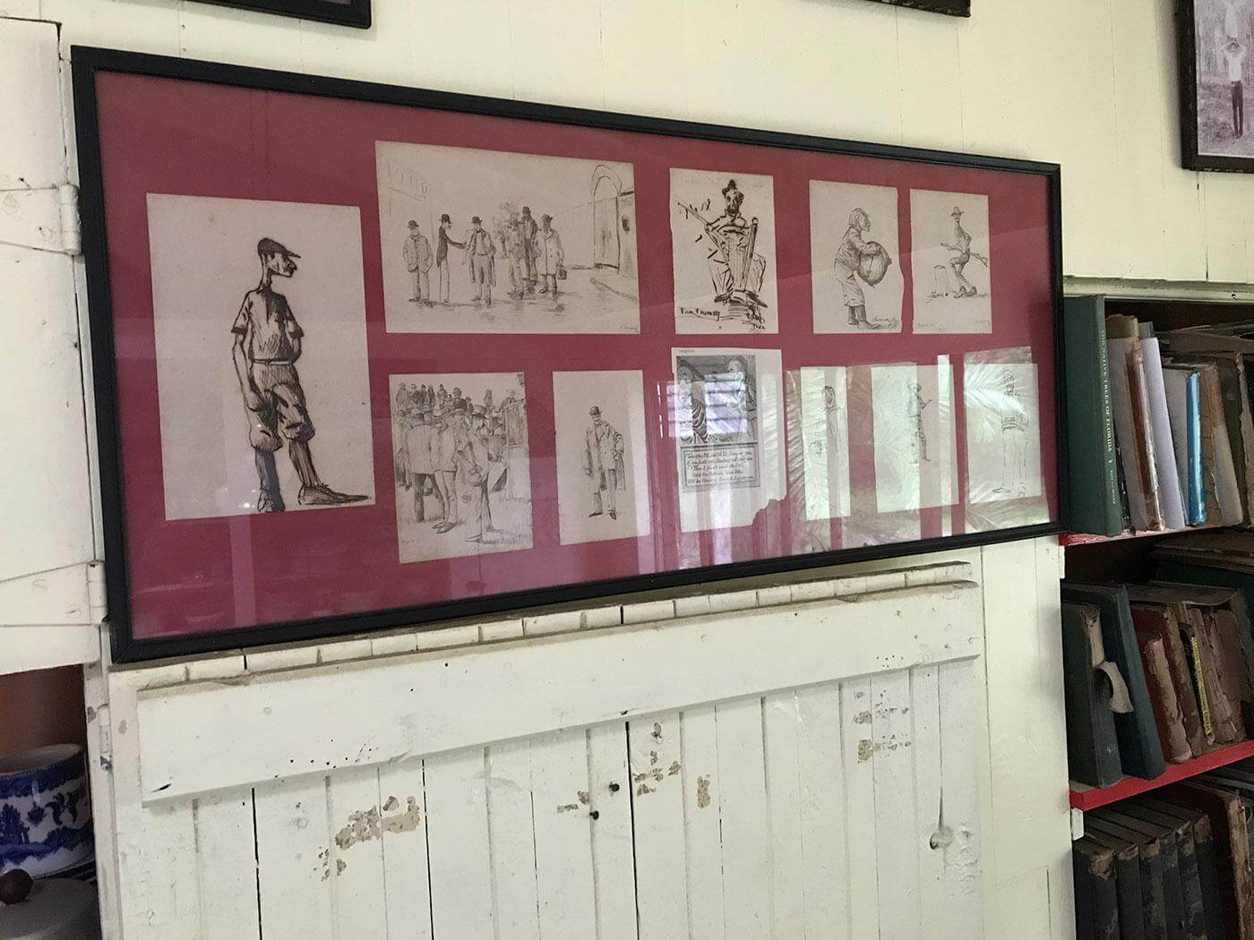 The Cup & Bucket was the name given to the main porch because of its proximity to the well and the always-present utensils for its use. The original kitchen and dining room was called the Cup and Bucket Inn, with Karl Moseley designing a whimsical sign for the building that included one of his rooster drawings.