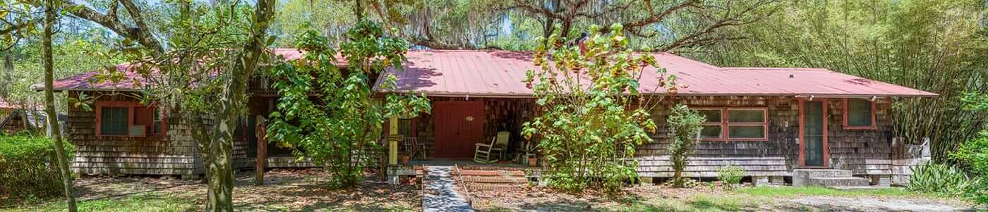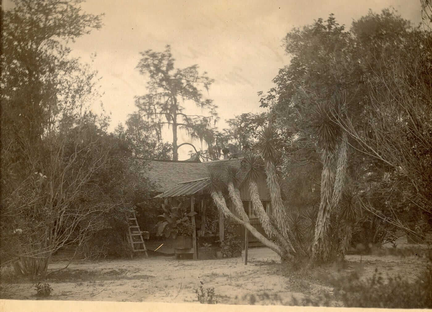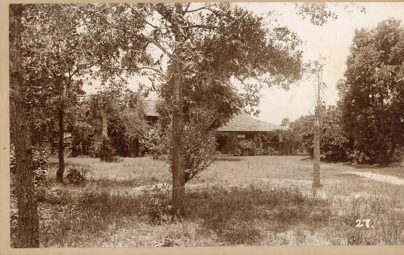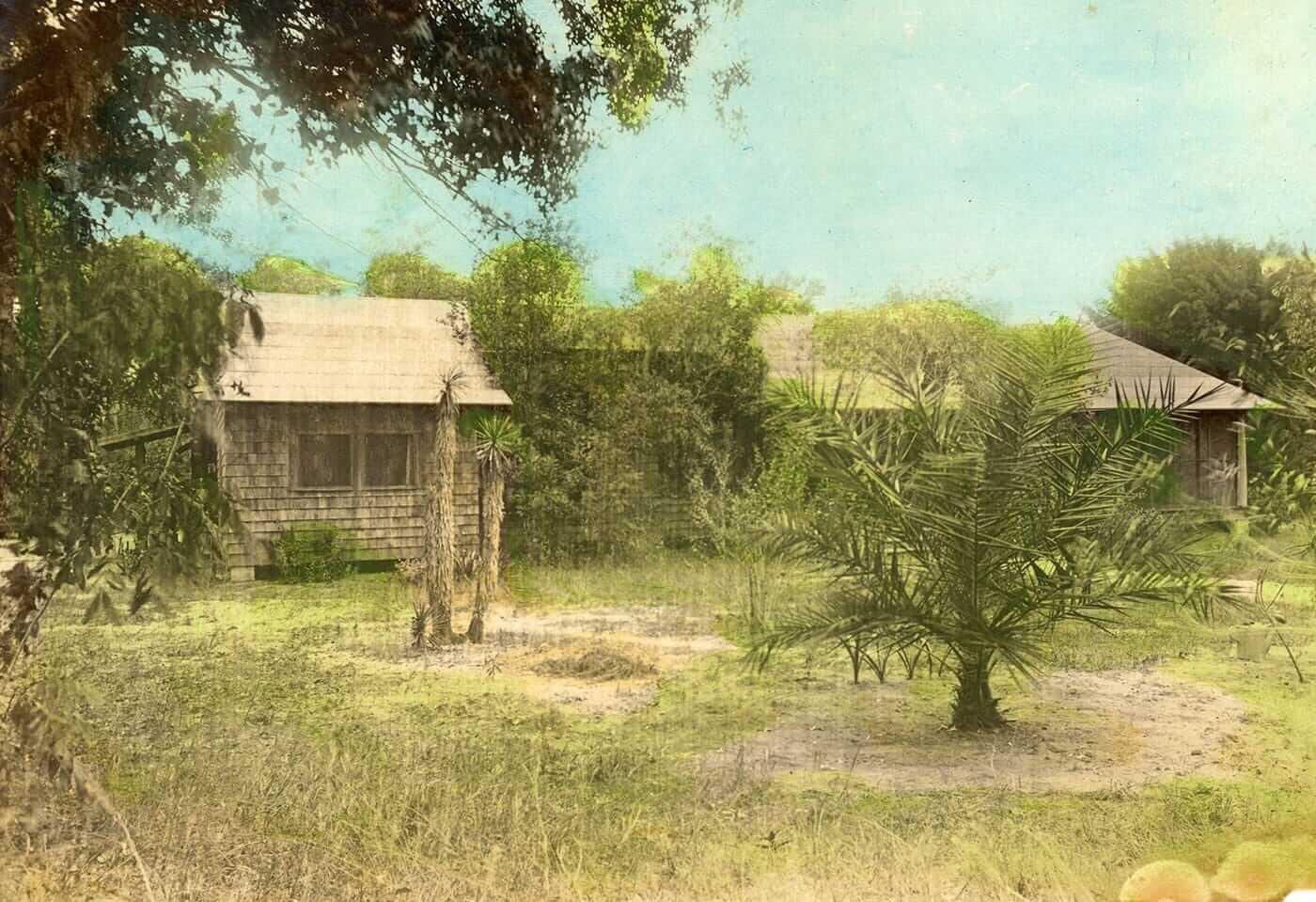 A hand-dug, above-ground well from the 1880s, famed for its great-tasting water, lies a few yards west of the main porch. This main home structure consists of three separate units arranged in a modified dog-trot style, designed to optimize the Florida climate. The primary living space features the Palm, a spacious living room with an exposed scissor-jointed ceiling and roof. The Palm is well-known for its Palmetto fiber wall covering. Other rooms include the Snug, which functions as a library, den, and office, and the Retreat, serving as a bedroom and bath. The Cuckoo is located to the south of the living area and is a separate room used today as a bedroom with an attached bath. The third section of The Nest comprises a dining room, a kitchen with a small nook, and the Lazarette, a storage and washing area.