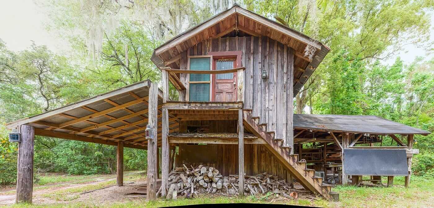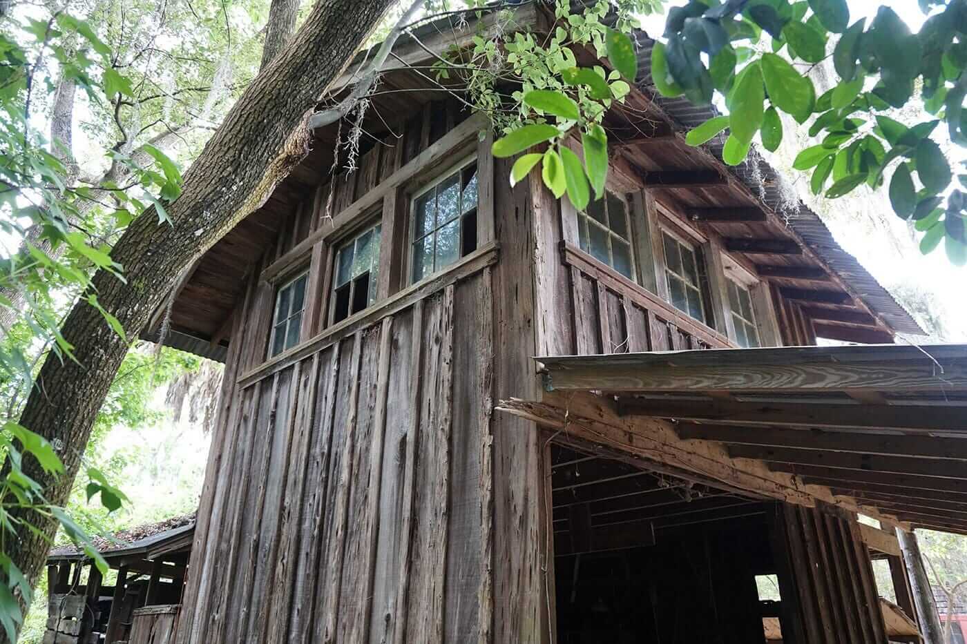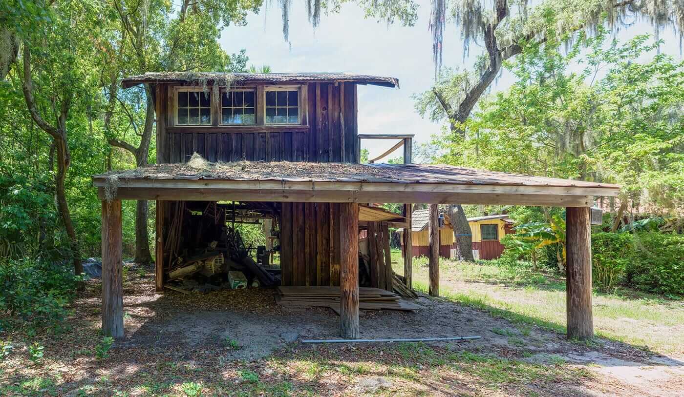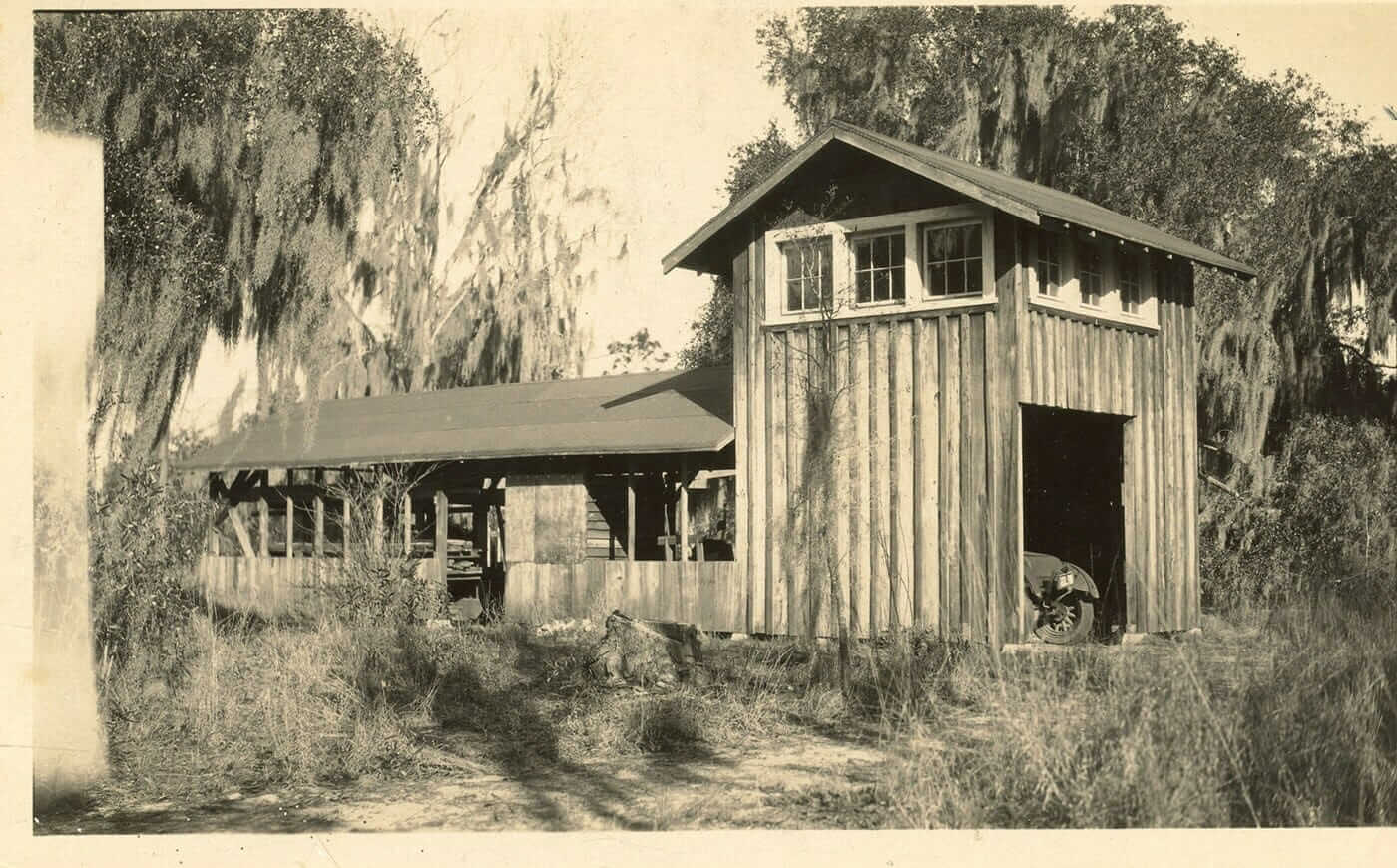 Constructed around 1925 above the garage and tool shed area at the Moseley Homestead, the “Owl’s Junction” served as the living quarters and studio, with a workshop below for Karl Moseley, the artist son of Julia Daniels Moseley and Charles Scott Moseley. Later, a shed roof carport was added to the east side of the workshop.