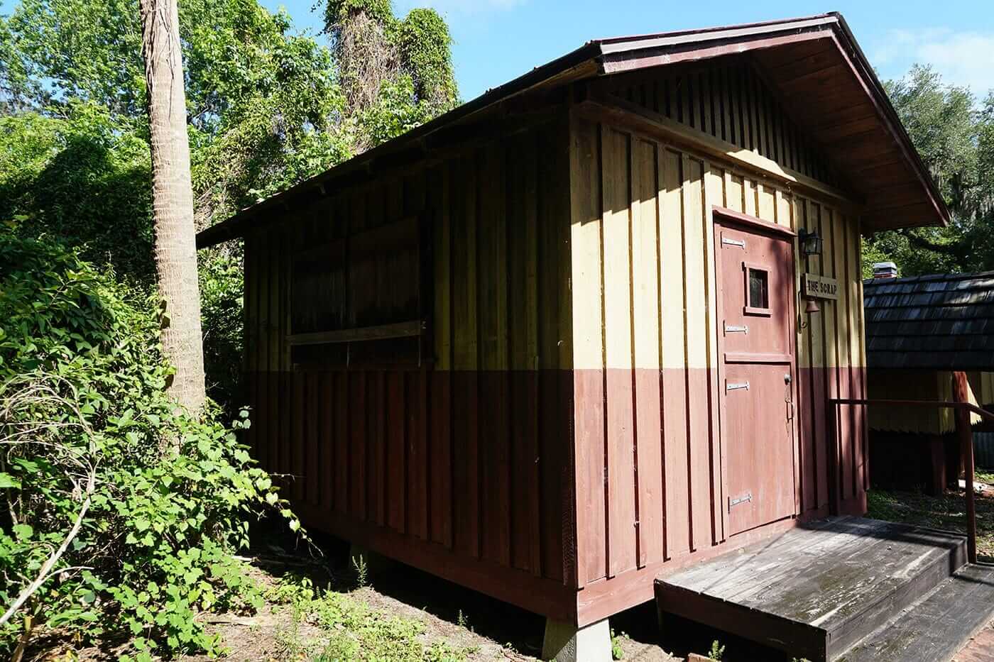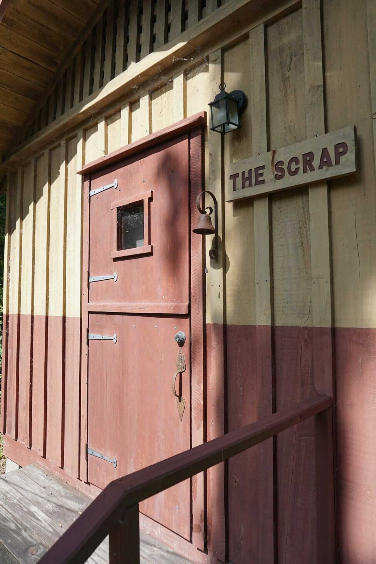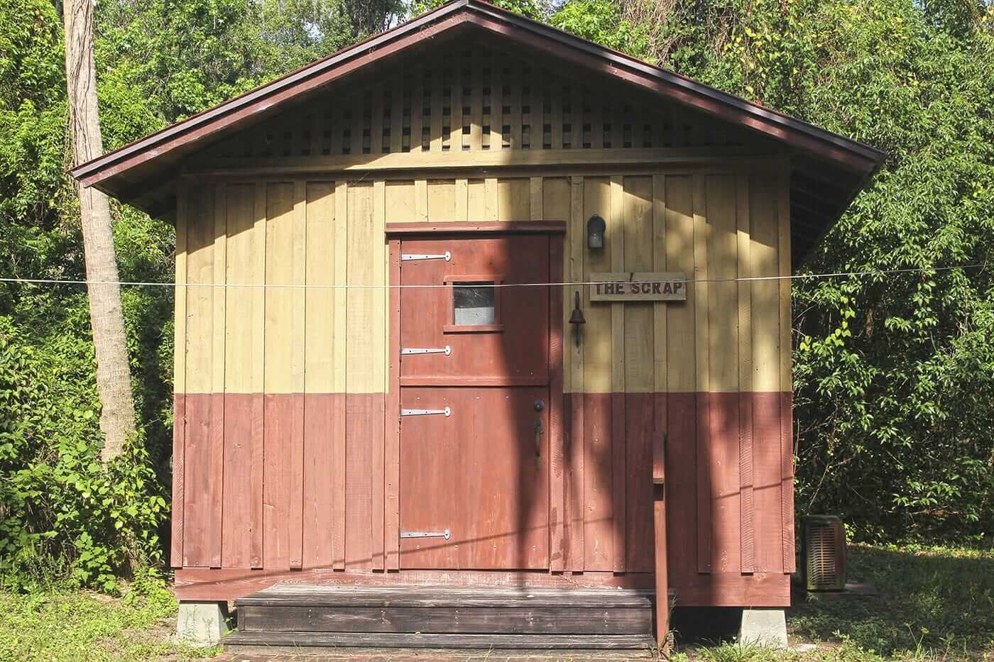 The Scrap was a small wooden structure used for storage and visiting relatives. The original Scrap no longer exists today, but in 2011, a new custom-built facility was constructed to replicate the late 19th-century structures on the homestead. The shed is designed to match the style of the main house and features cypress board-and-batten siding and exposed rafter tails. Its front includes a custom Dutch door and lattice details taken from existing buildings on the property. Salvaged historic windows were also used for the Scrap.