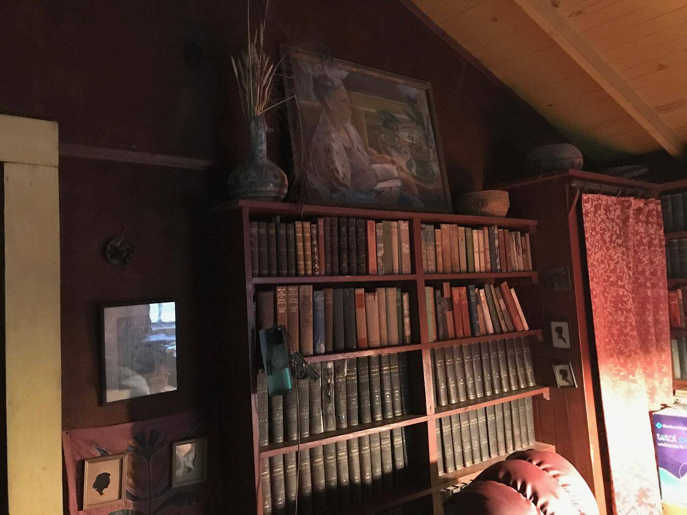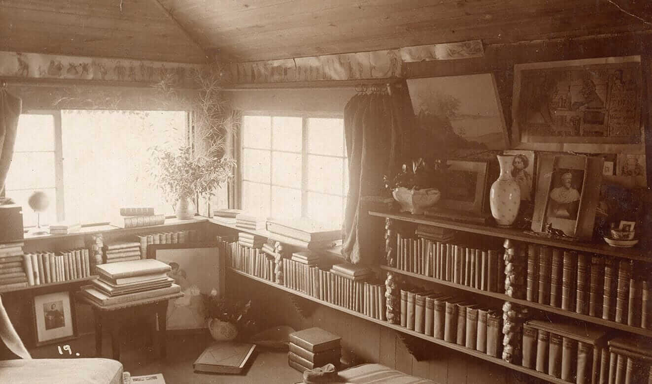The Snug is a long office and library room located off the north end of the Palm, featuring a fireplace along the south wall. It was originally a bedroom for Julia and Scott Moseley until the Retreat was added to the structure in the 1940s. Even when it served as a bedroom, the Snug also functioned as a library and was furnished with overstuffed chairs and cushions to promote comfort and study.